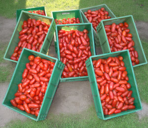Einkoch-Romatomaten zu verteilen ist eine Wissenschaft für sich. Es werden je nach aktueller Ernte extrem viele Tomaten auf ein Mal geerntet und an diejenigen Mitglieder verteilt, die sie gerne haben möchten.