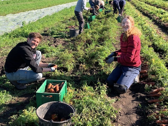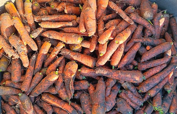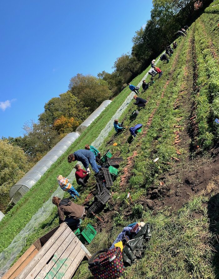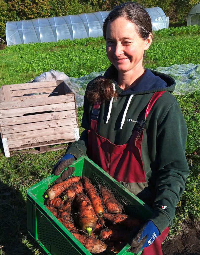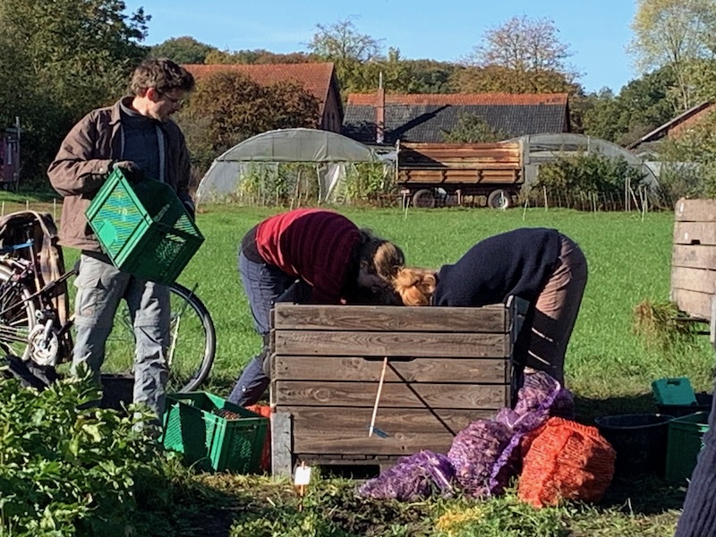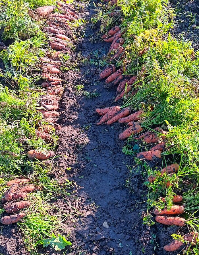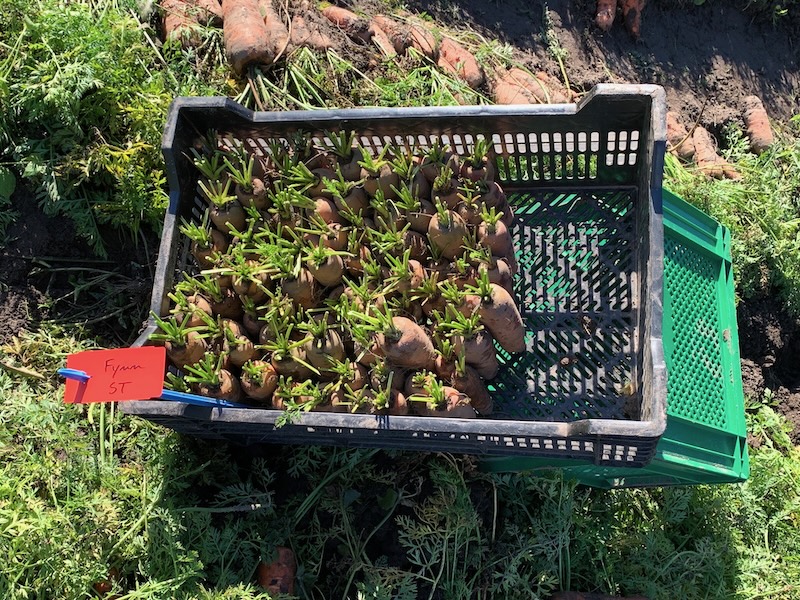 Die Möhrenernte bei frischkaltem Sonnenwetter war ein großes Vergnügen – da der Boden im Fachjargon „unterschnitten“ wurde, konnten wir die duftenden Möhren ohne jede Mühe herausziehen. Mit einem Griff ins Grün hatte man gleich 4-5 gut gewachsene Fynn-Möhren an der Angel, das ging ruckzuck – wenn Arbeit immer so leicht wäre!